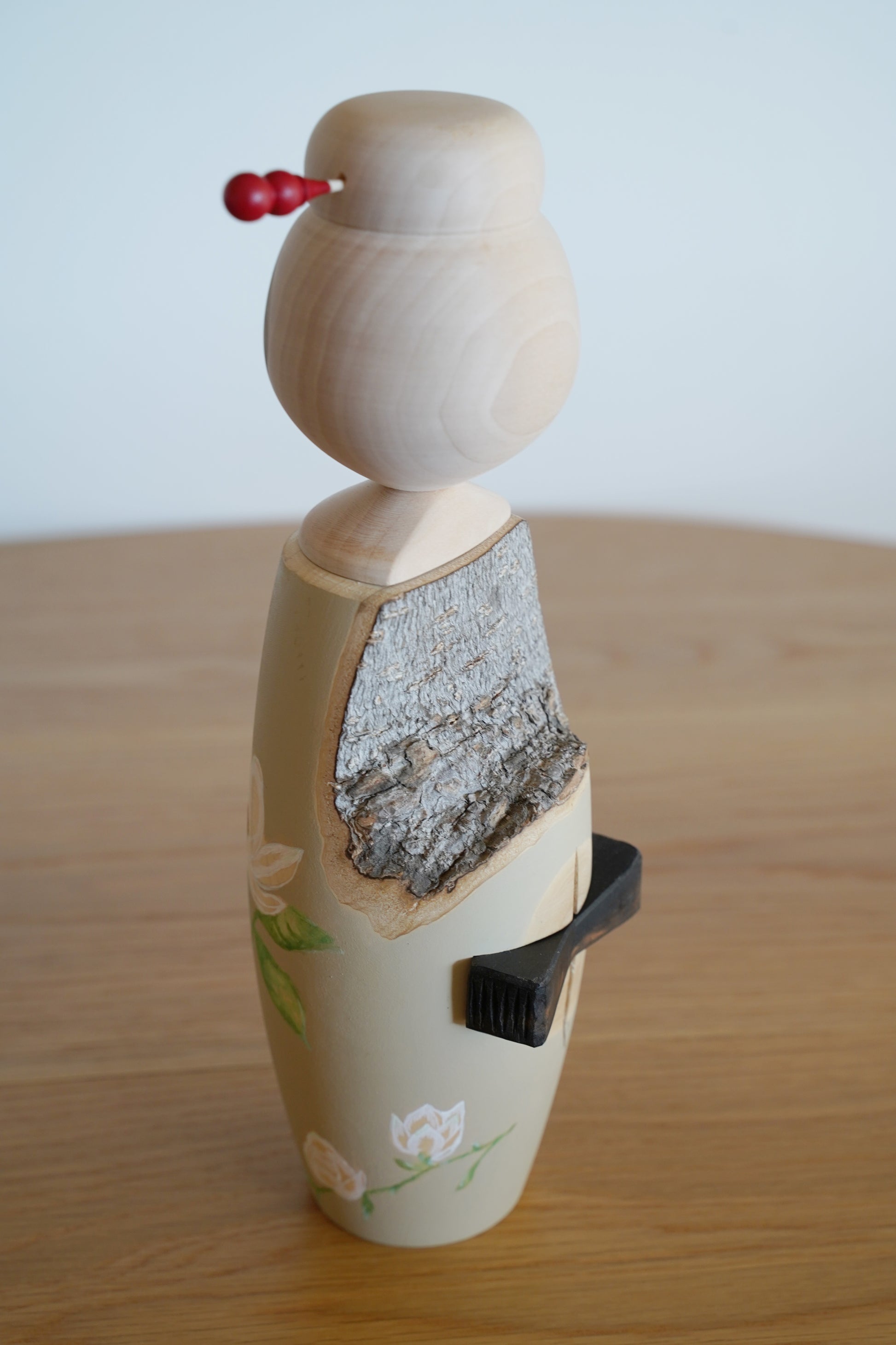 Painted Magnolia Kokeshi Doll with Natural Edge & Ebony Tie