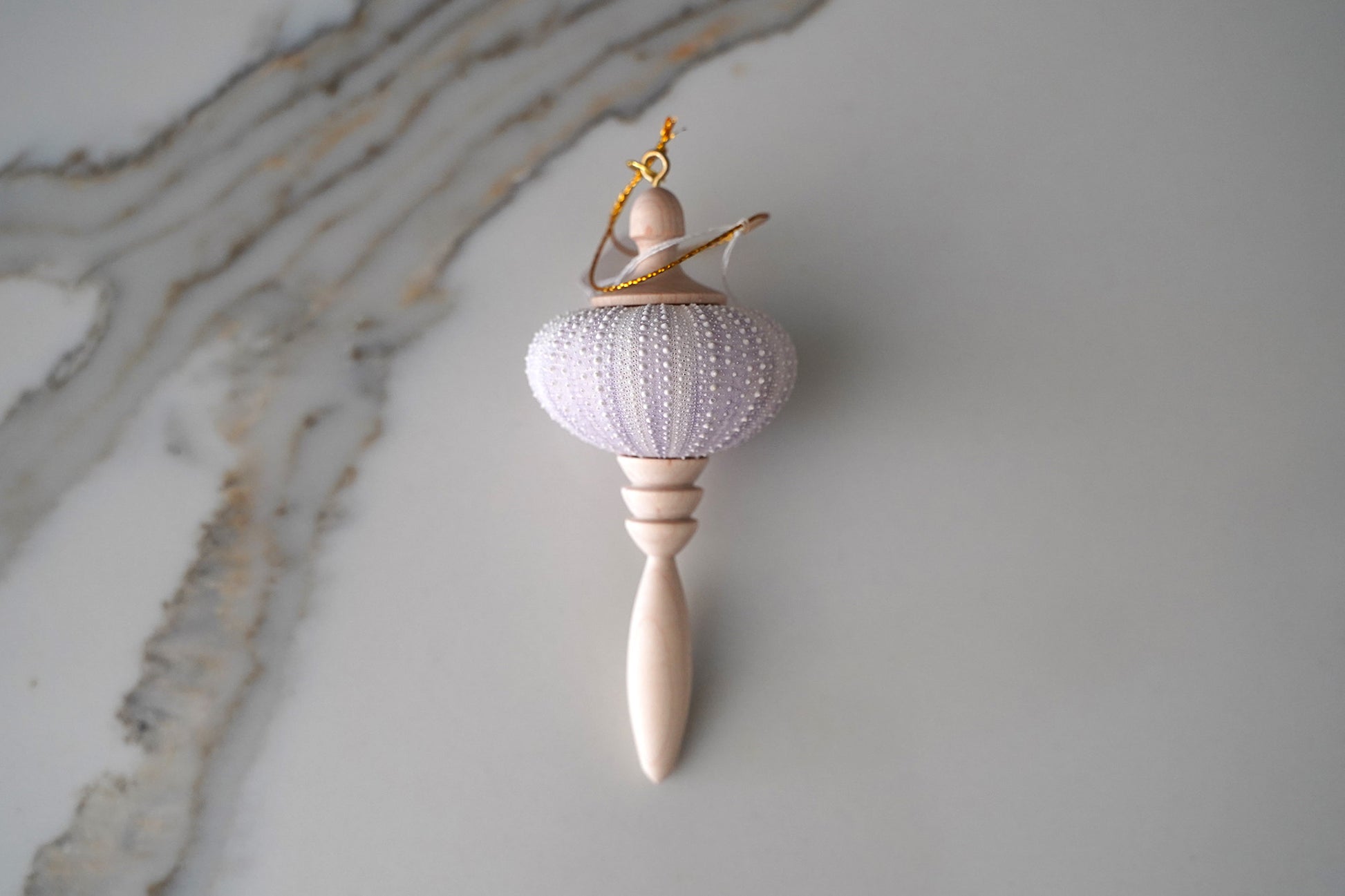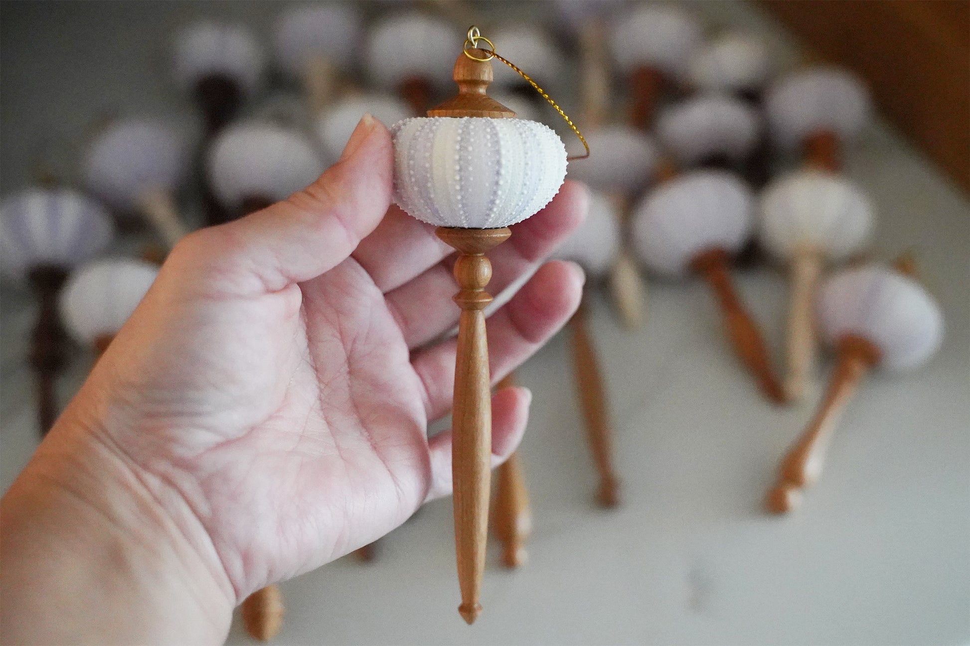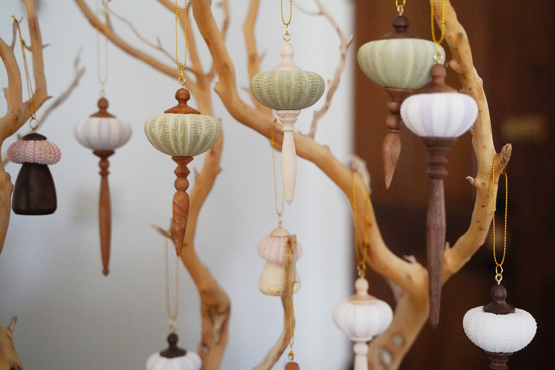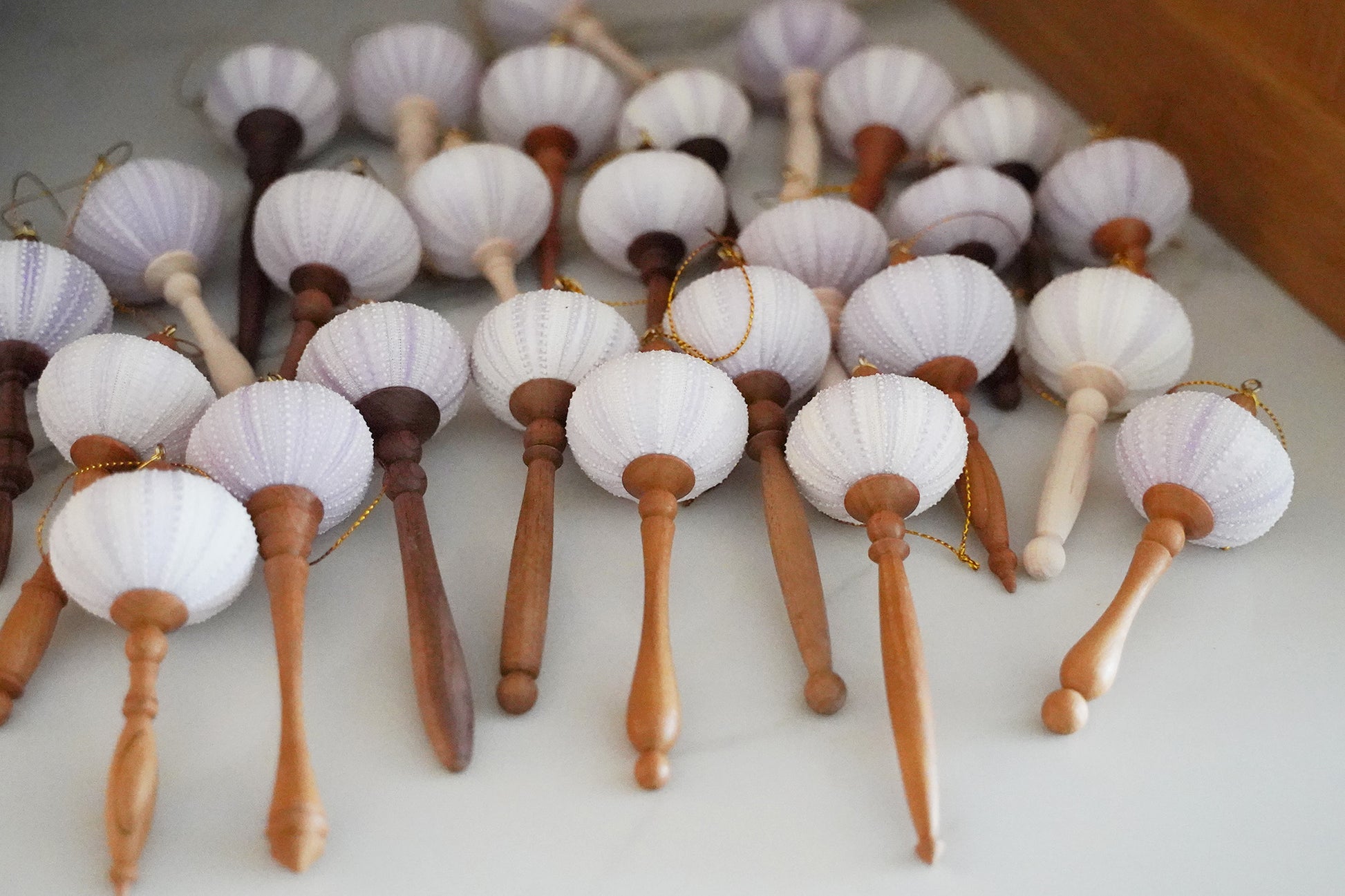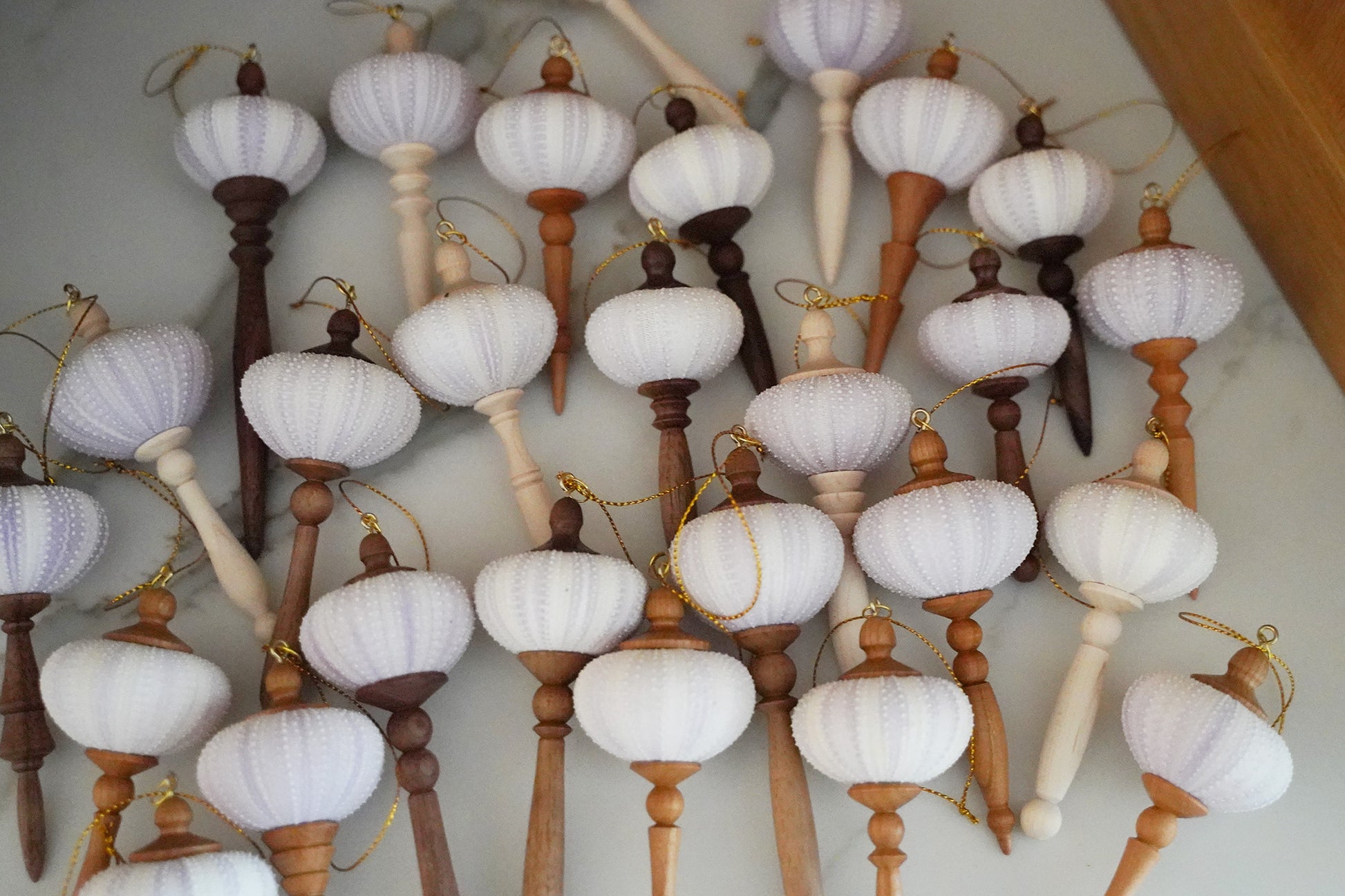 Tree ornaments made with beautiful purple sea urchins and various wooden spindles.